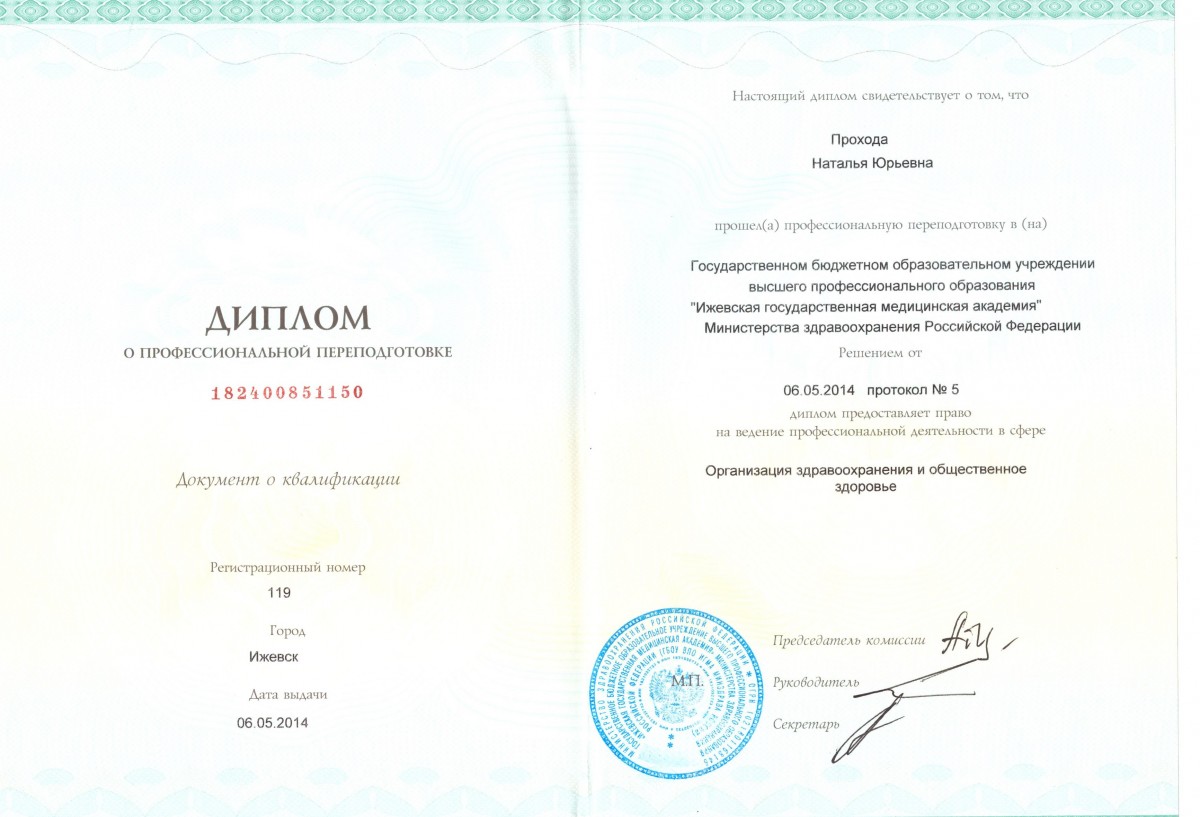 Переподготовка. Башкирский государственный медицинский университет «Ультразвуковая диагностика», Диплом ПП-1 № 849743